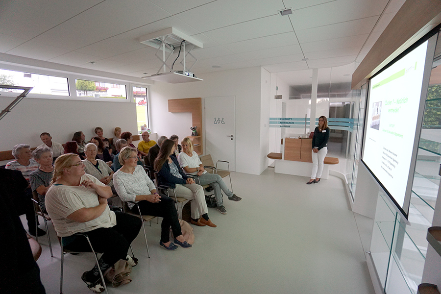 Der Wartebereich kann außerhalb der Ordinationszeiten – bei Bedarf auch am Wochenende – für kleine Vorträge und Kurse für bis zu 20 Teilnehmern genutzt werden. Eine fest installierte Leinwand und ein Deckenbeamer stehen zur Verfügung; die Nutzung erfolgt nach Vereinbarung.